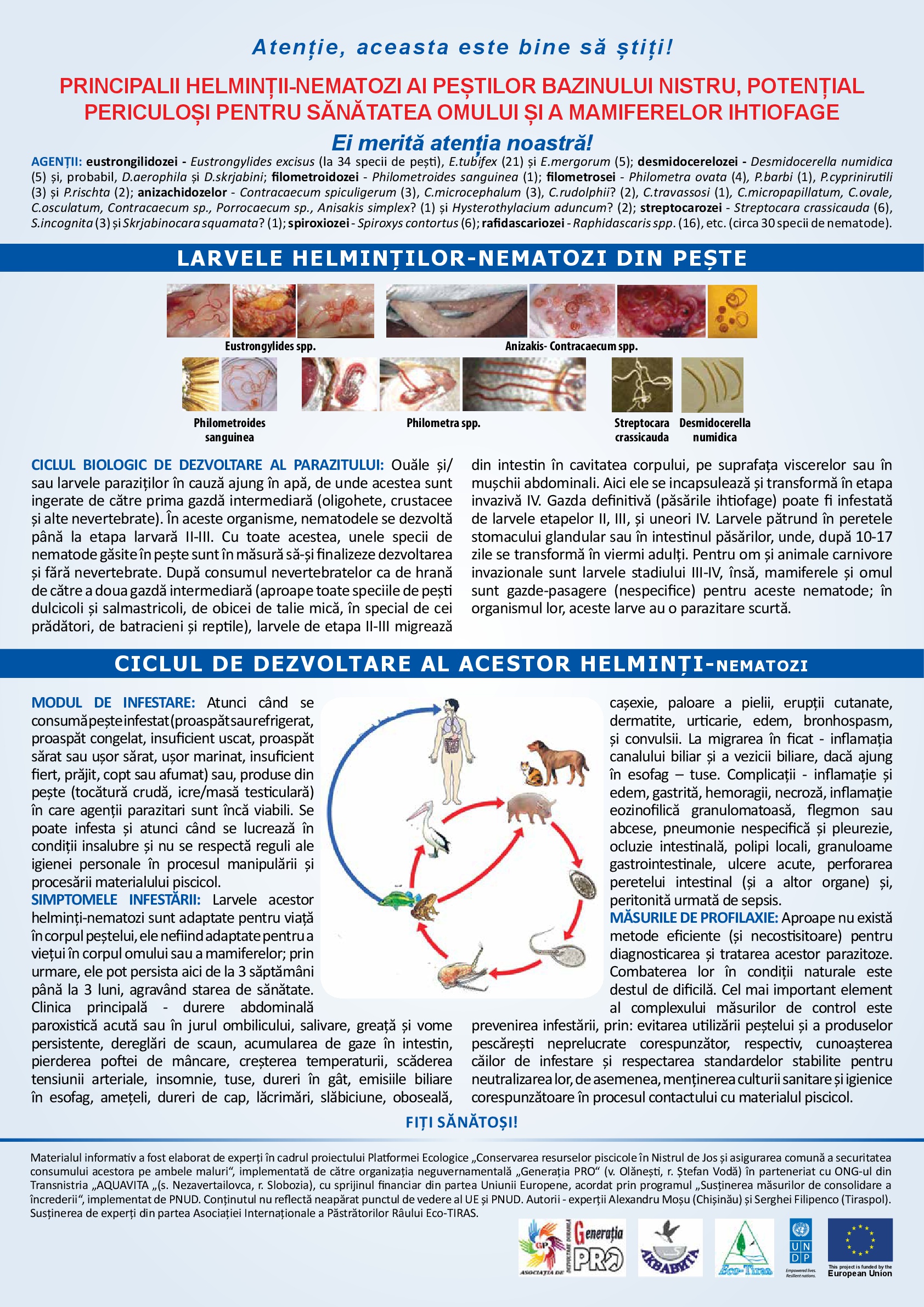 Viermii paraziți ai peștilor din bazinul Nistrului transmisibili omului : Alexandru Moşu; coordonator: Trombițki Ilia. – Chişinău : Eco-TIRAS, 2021 (Tipogr. Arconteh SRL).–26 p Download.